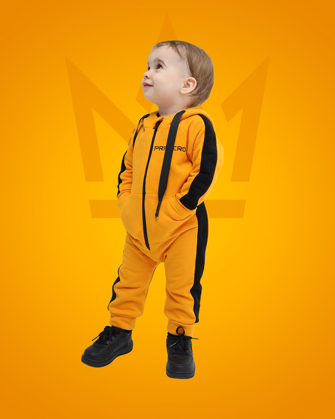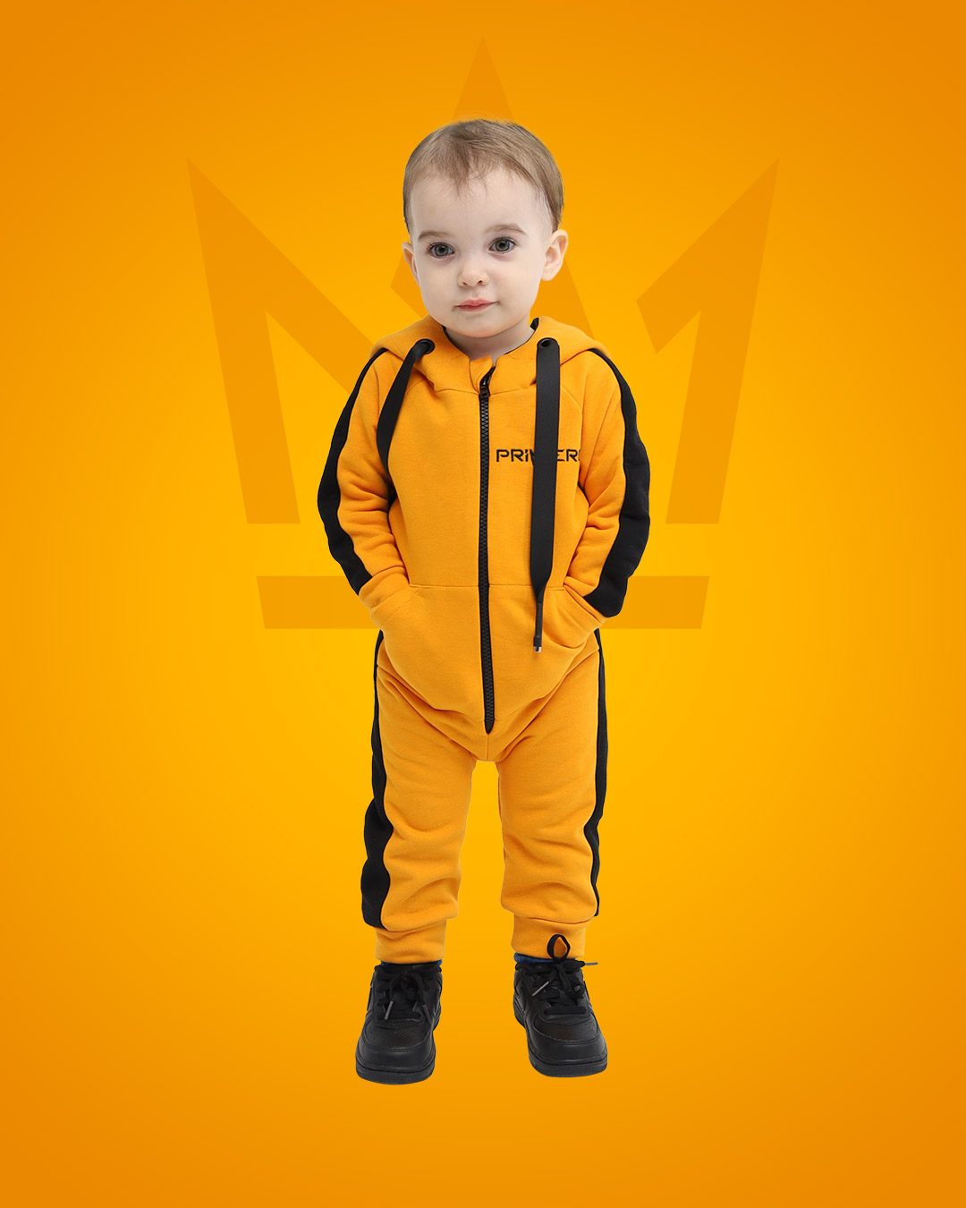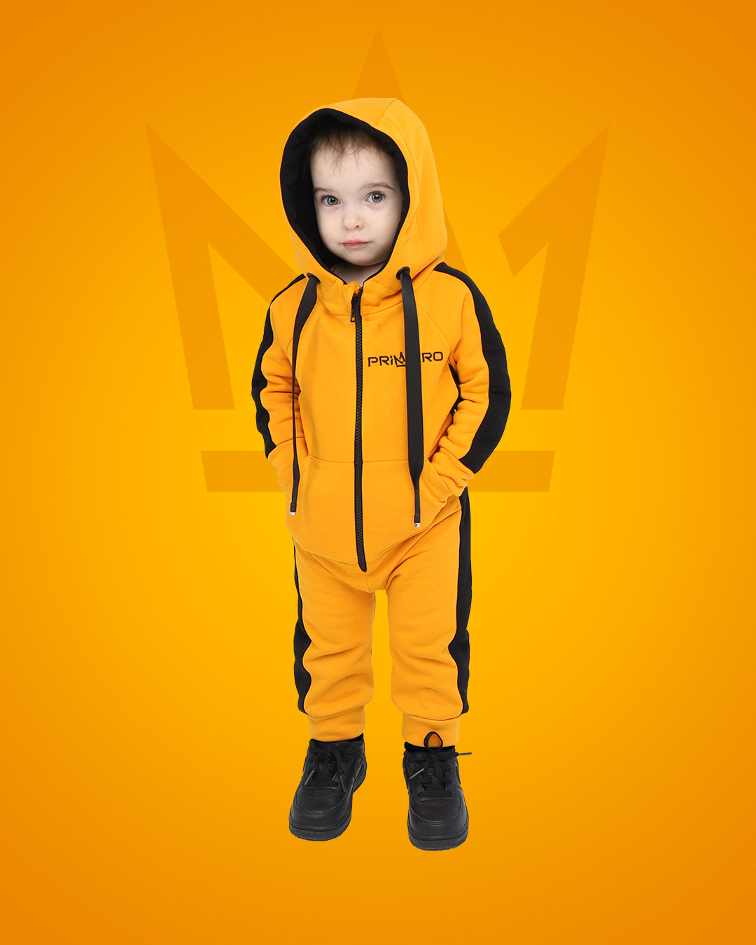 Комбинезон с лампасами кроя реглан с японской пластмассовой молнией YKK, двойным капюшоном с вышивкой логотипа в виде короны, боковыми карманами, широким шнурком, нержавеющими люверсами, манжеты с декоративными строчками, пояс с плотной широкой резинкой STRONG, которая не теряет свою эластичность в процессе носки и обеспечивает комфортную посадку изделия, на левой штанине вышивка логотипа PRIMERO .