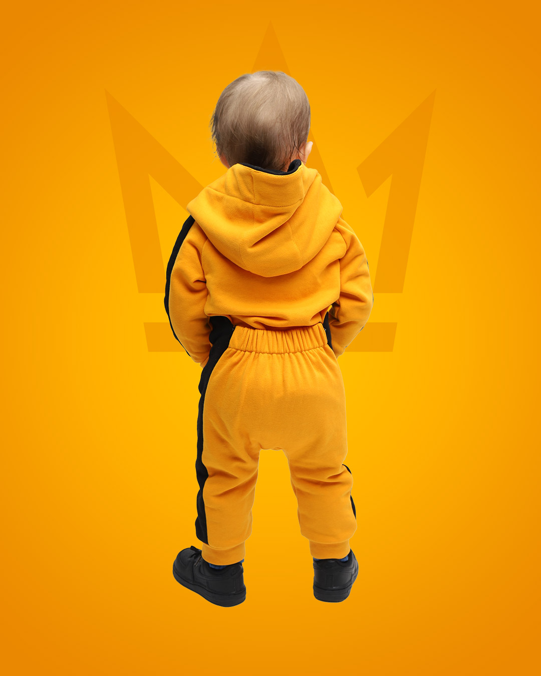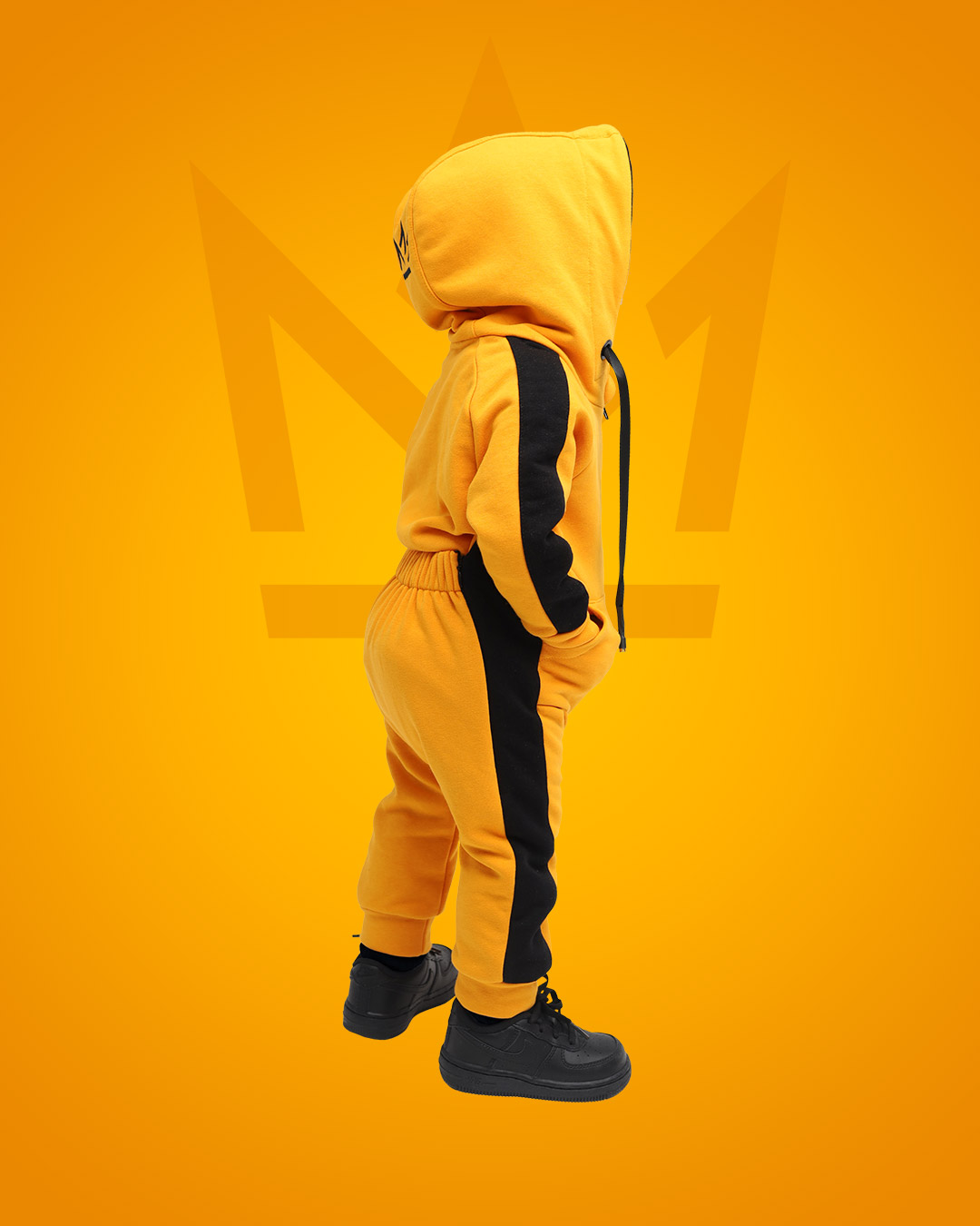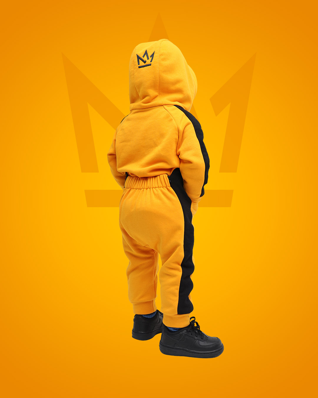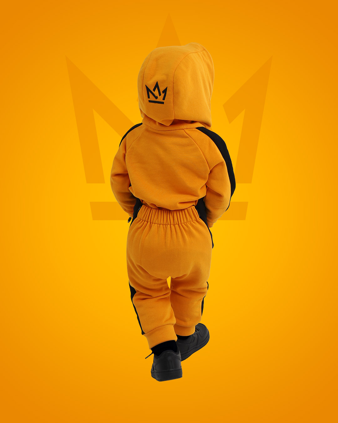 Комбинезон с лампасами кроя реглан с японской пластмассовой молнией YKK, двойным капюшоном с вышивкой логотипа в виде короны, боковыми карманами, широким шнурком, нержавеющими люверсами, манжеты с декоративными строчками, пояс с плотной широкой резинкой STRONG, которая не теряет свою эластичность в процессе носки и обеспечивает комфортную посадку изделия, на левой штанине вышивка логотипа PRIMERO .