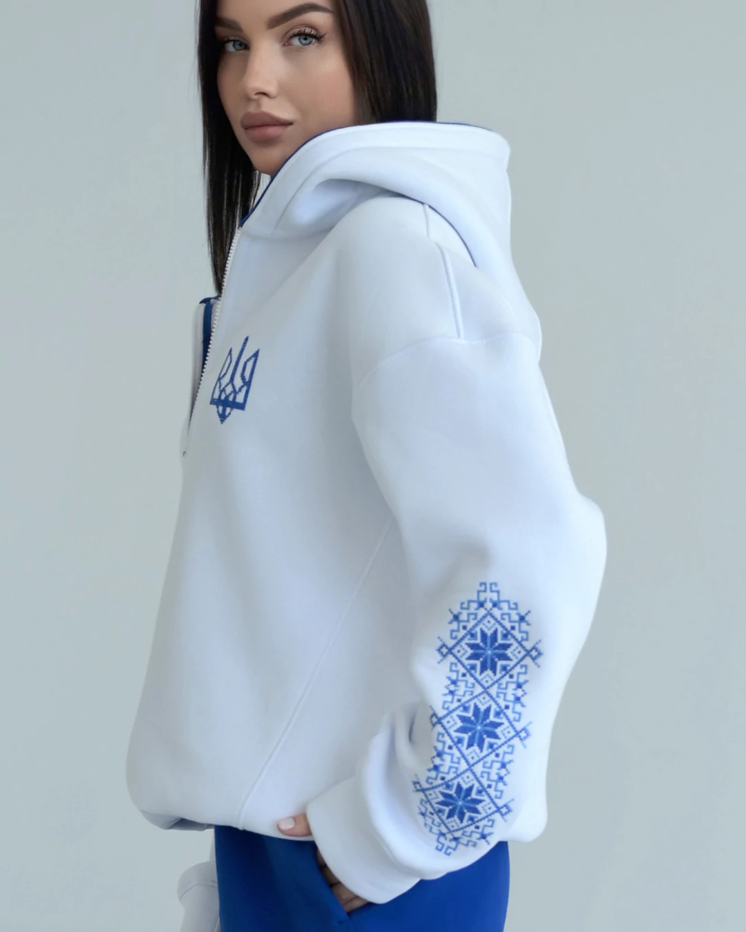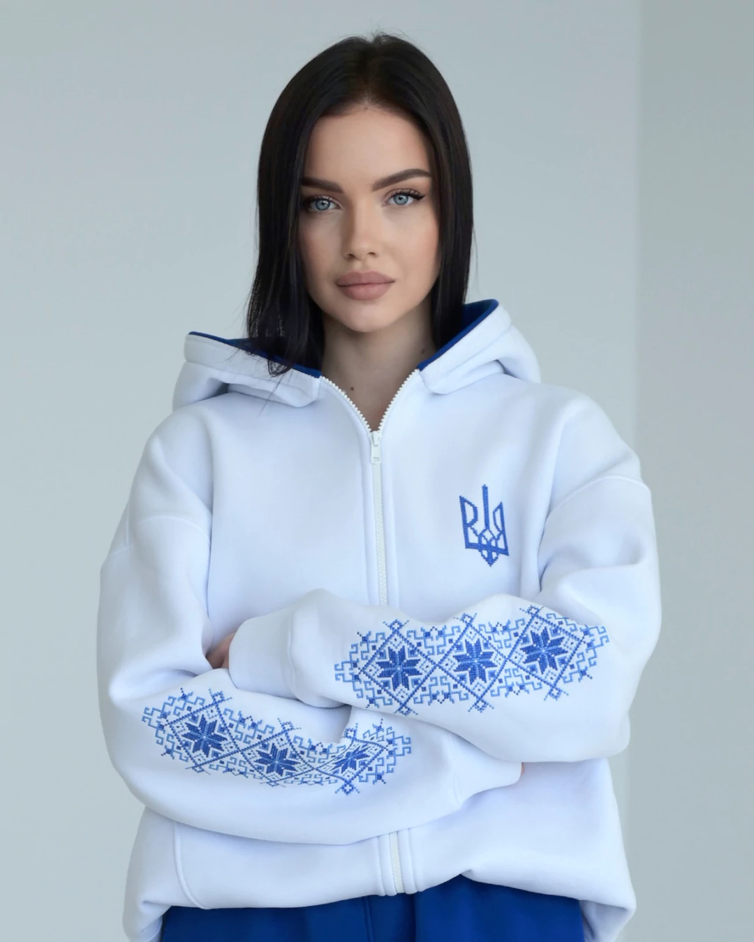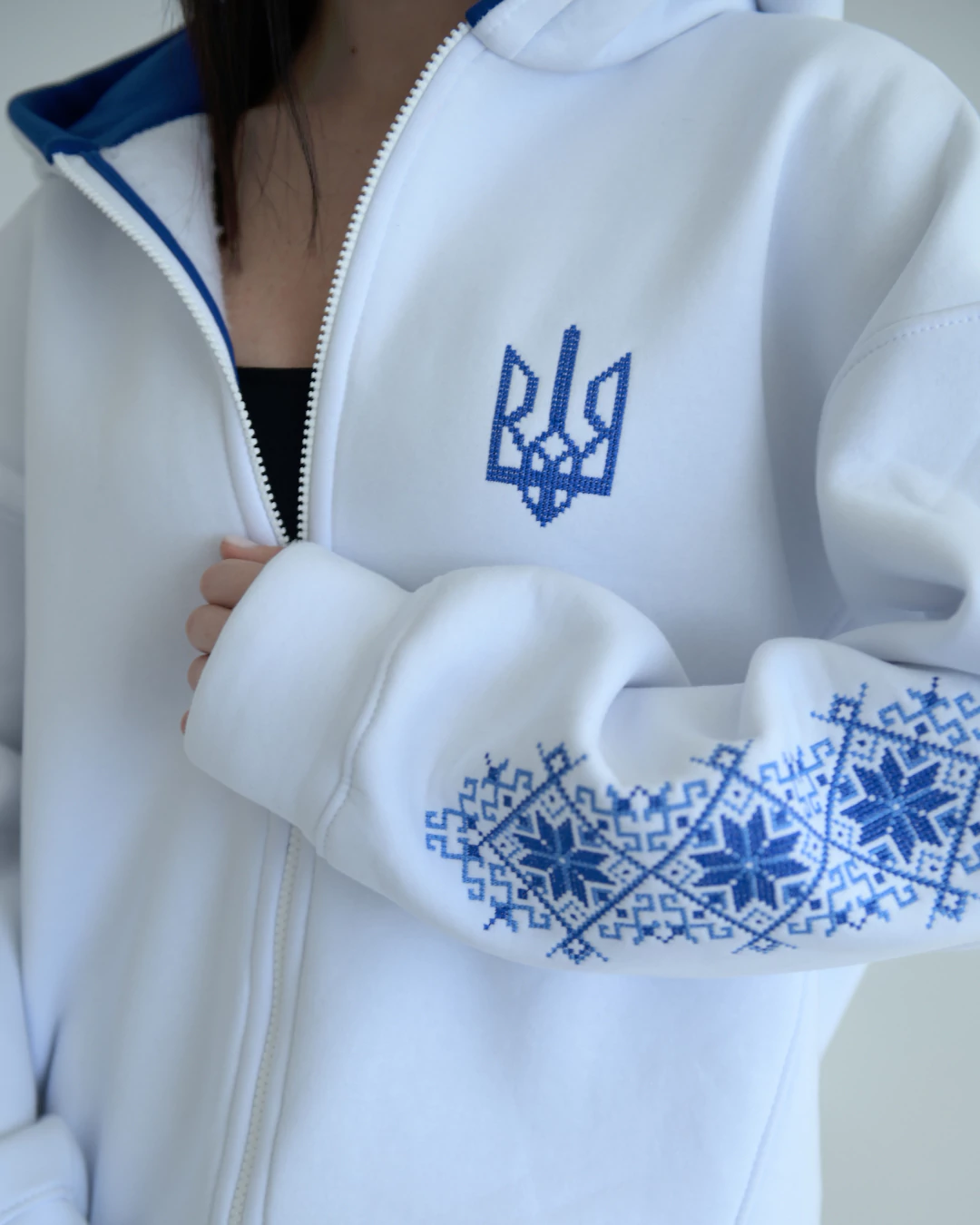 ВЫШИВКА КРЕСТИКОМ: ГЕРБ УКРАИНЫ на груди, УКРАИНСКИЙ ОРНАМЕНТ на рукавах и КОРОНА на капюшоне (или другие вышивки на выбор).