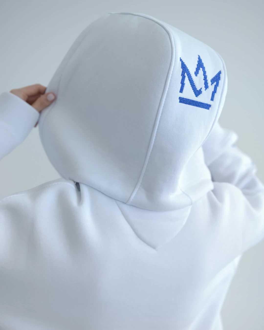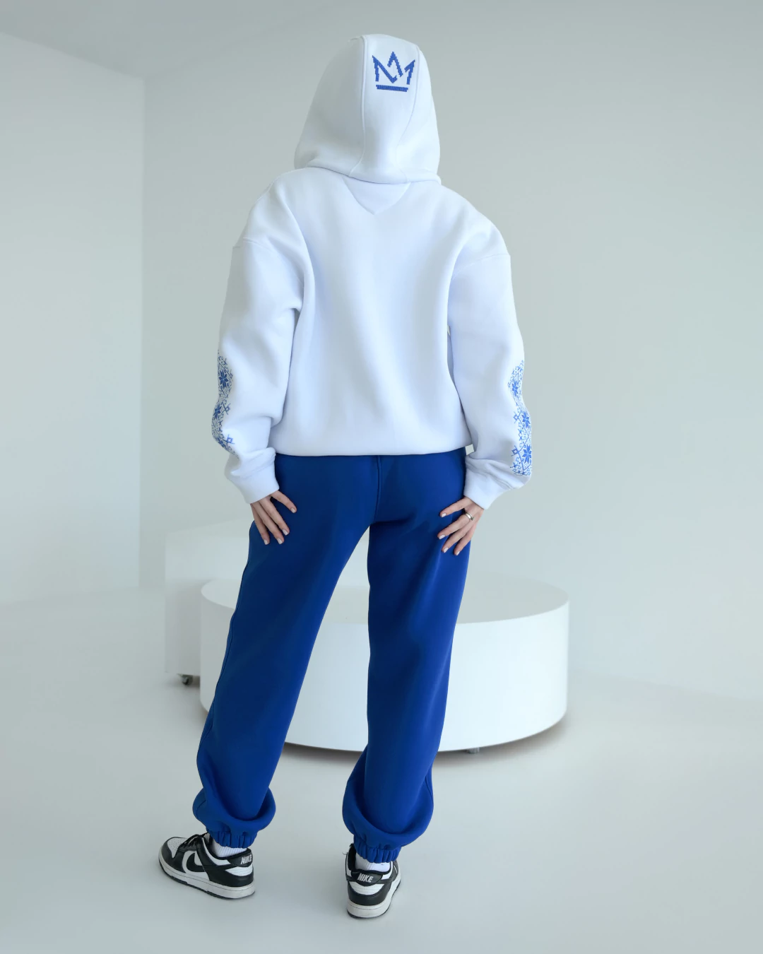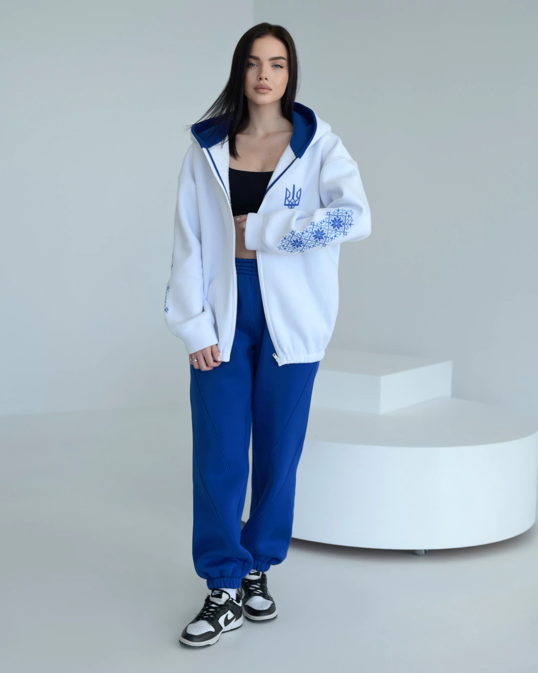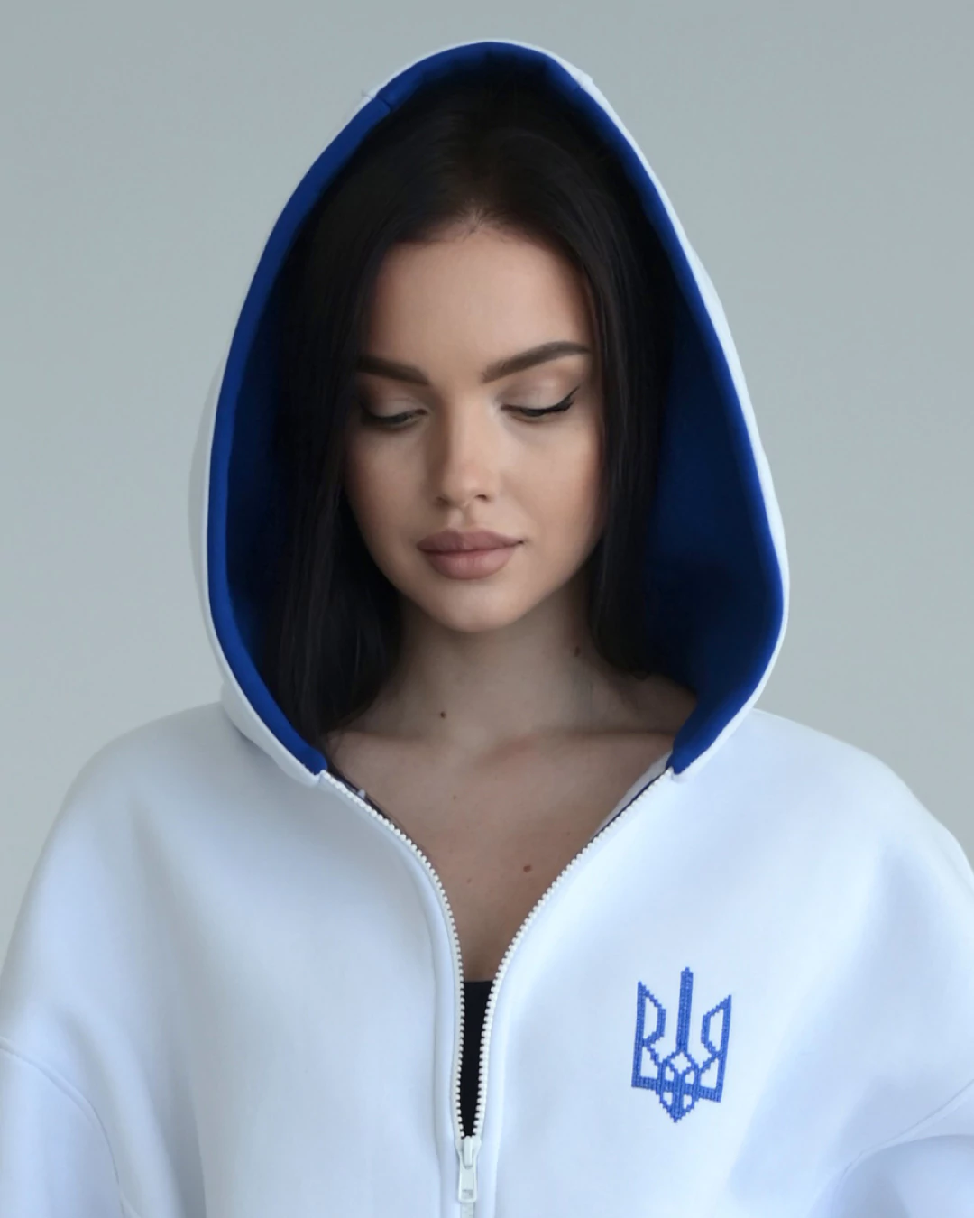 ВЫШИВКА КРЕСТИКОМ: ГЕРБ УКРАИНЫ на груди, УКРАИНСКИЙ ОРНАМЕНТ на рукавах и КОРОНА на капюшоне (или другие вышивки на выбор).