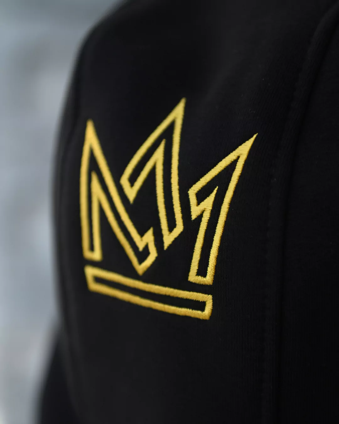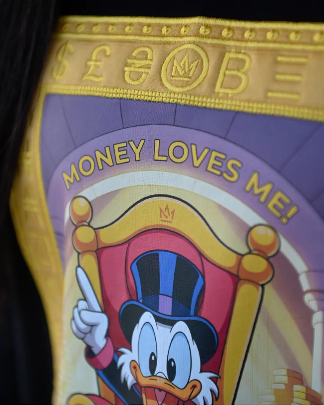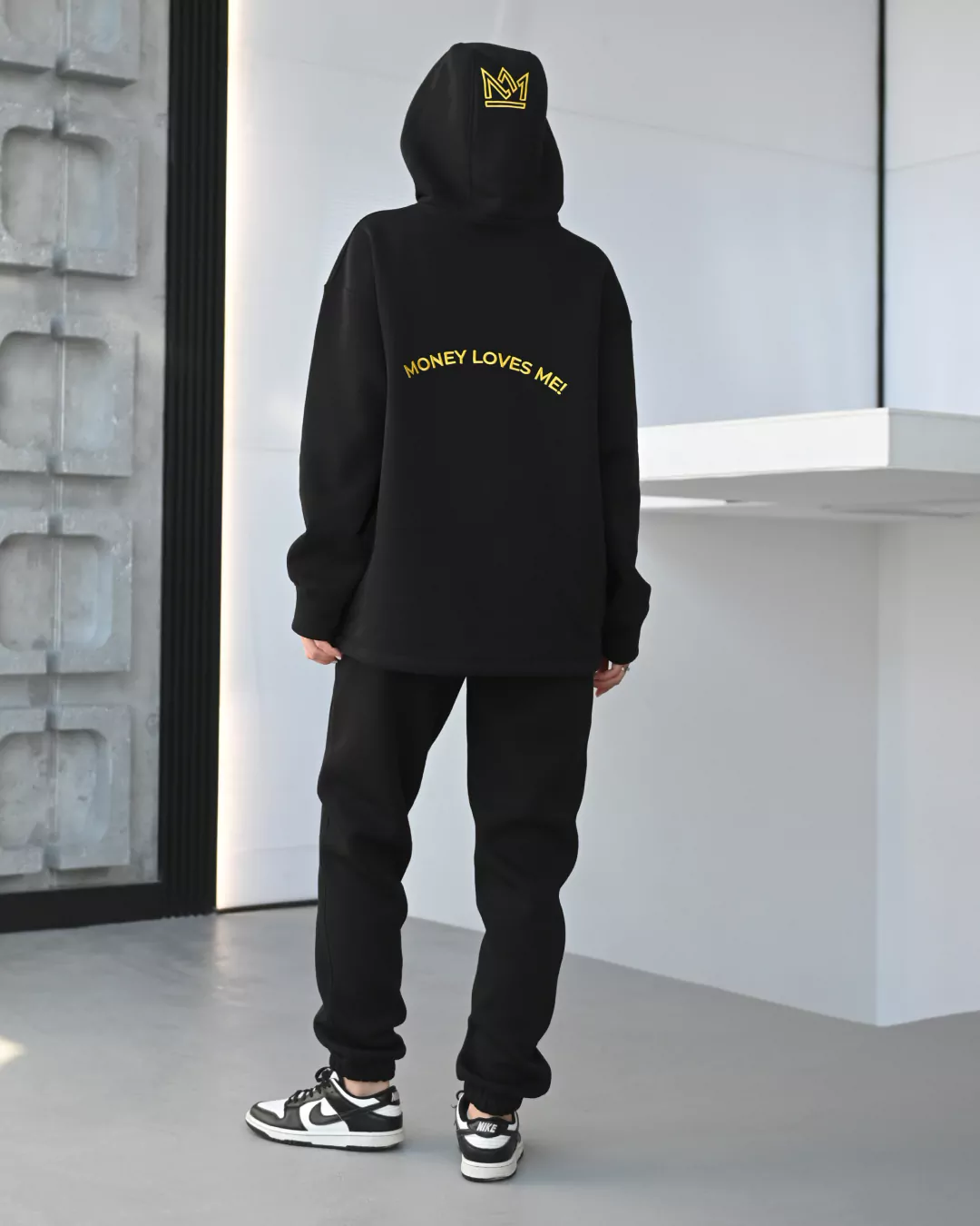 ВЫШИВКА: РАМА со ЗНАЧКАМИ различных ВАЛЮТ на груди, MONEY LOVES ME на спине и КОРОНА на капюшоне (или другие вышивки на выбор).
