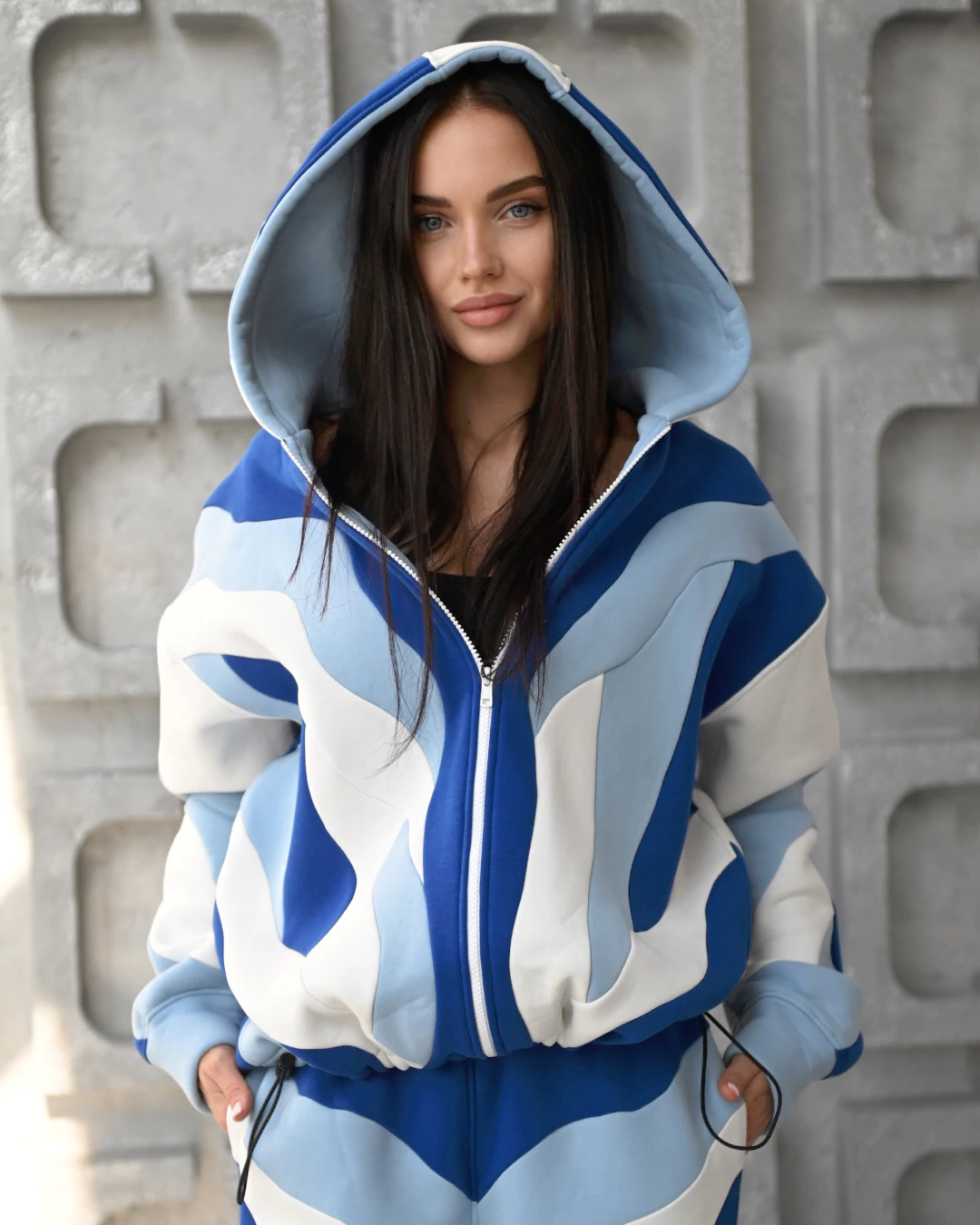 ХУДИ колорблок на молнии с затяжками и двойным капюшоном.